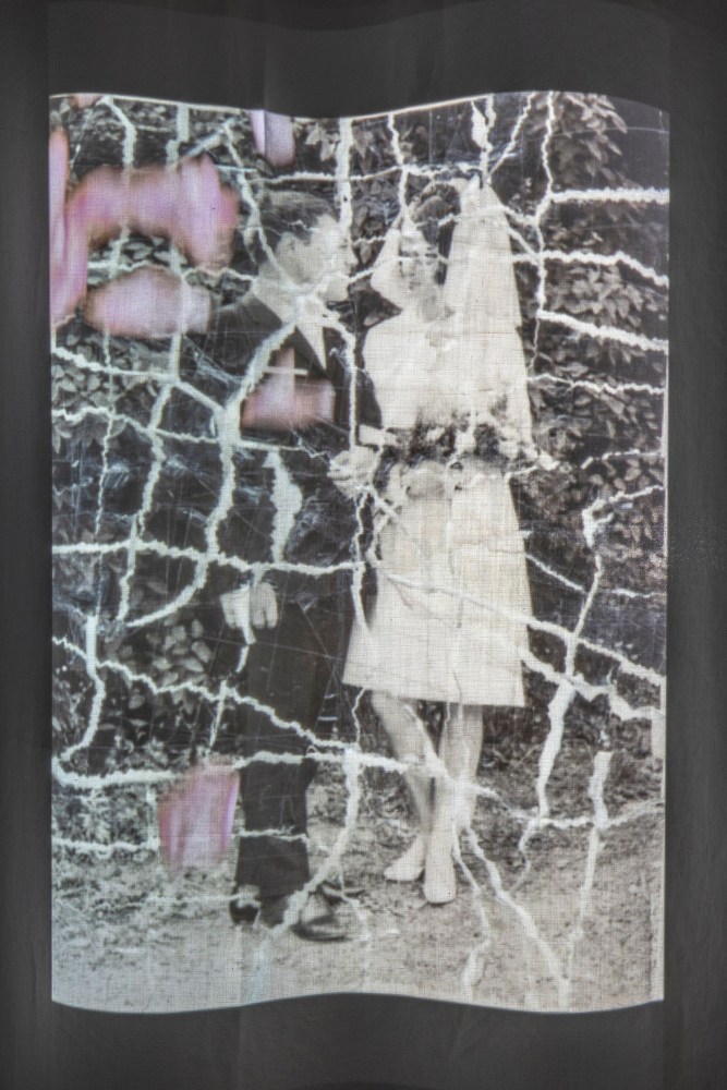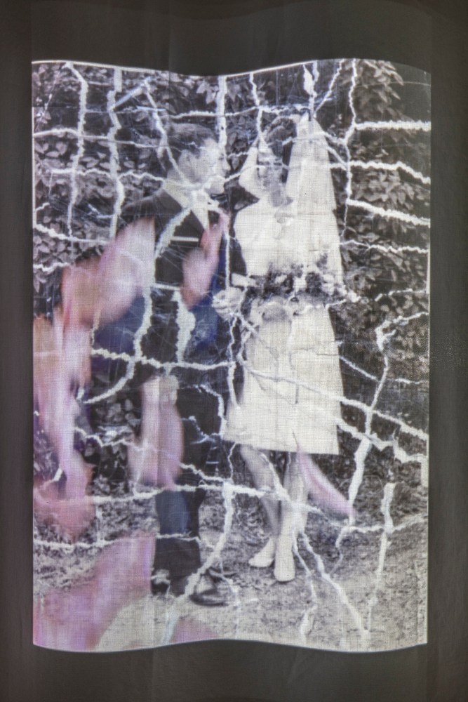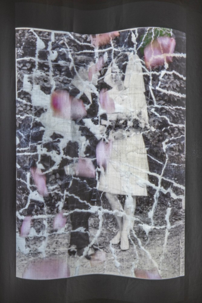 es werden Rosen sein wie je, Installation (Stoff, Filmprojektion, Rosen), Details, 220 x 110 x 100 cm, 2020/2023