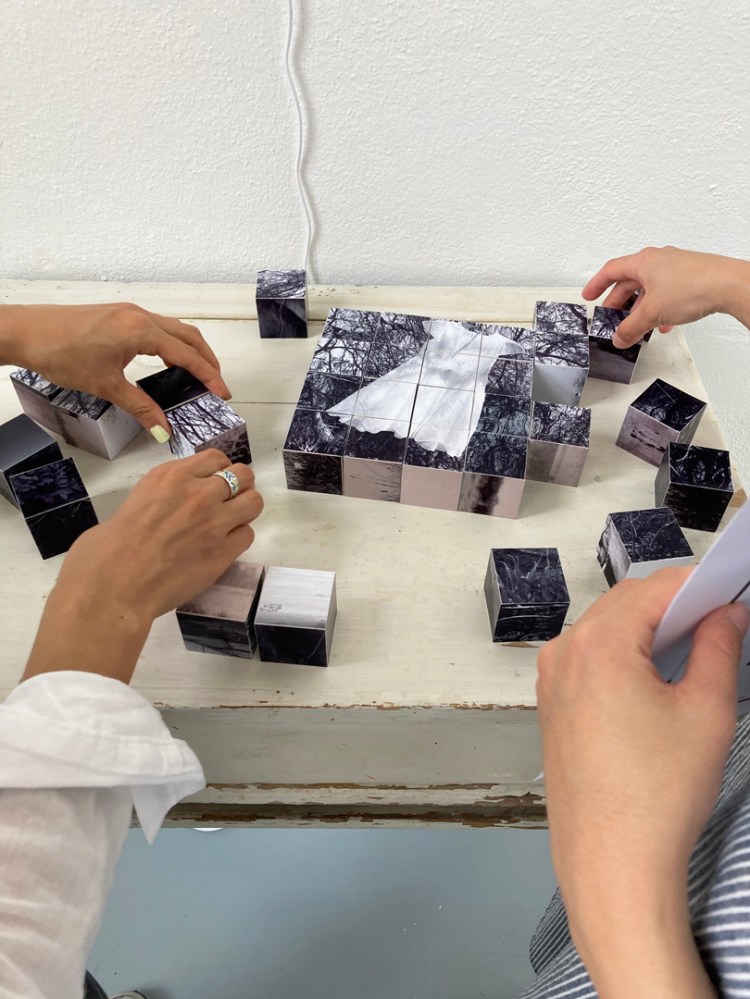 Installation II (Fotodrucke auf Glas, Leuchtkasten, Schrankfragment, Fotodrucke auf Puzzle), Detailansicht, 120 x 70 x 45, 2023