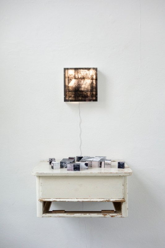 Installation I (Schubladen, Fotodrucke auf Glas und Papier, Licht), 150 x 60 x 40 cm, 2023