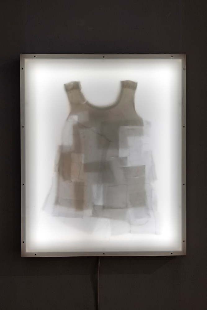 Fragmente eines Kinderhemdes, Wachs, Gaze, Leuchtkasten