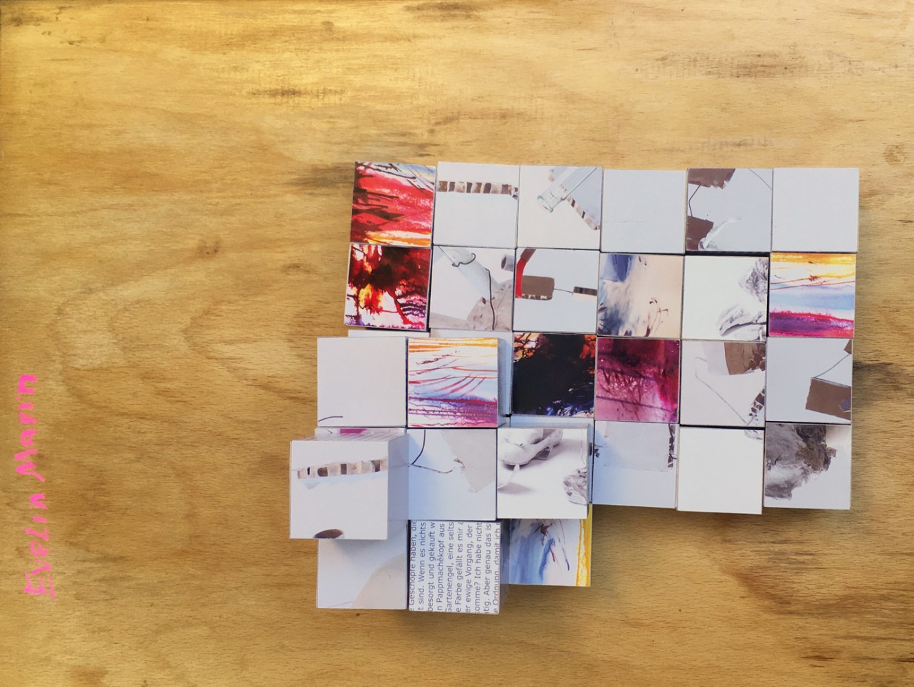 Auseinandersetzung in Text und plastischer Arbeit in Form eines Würfelpuzzles (sechs Fotos von Stadien einer Skulptur).